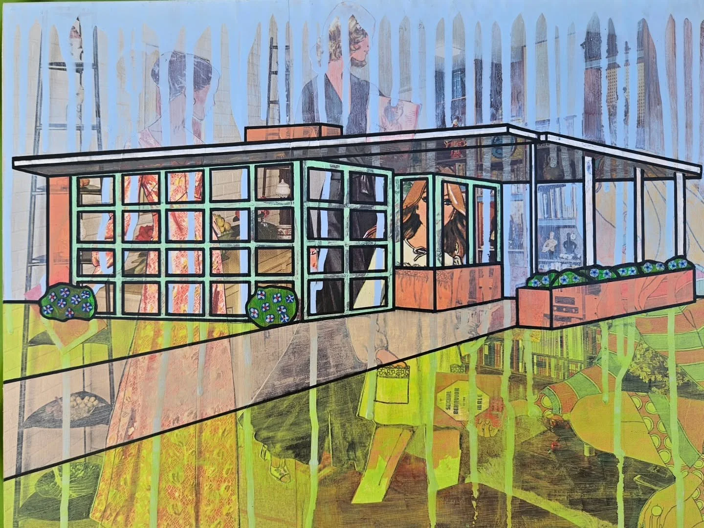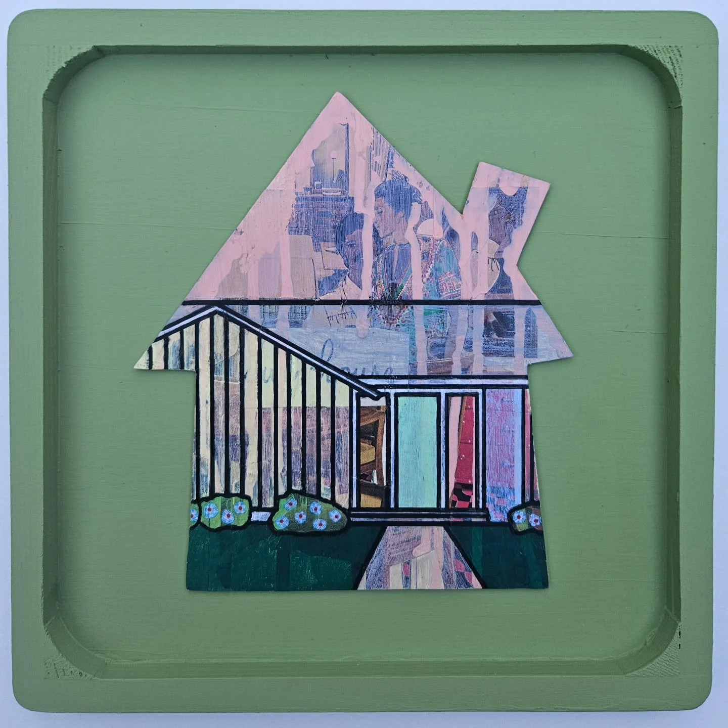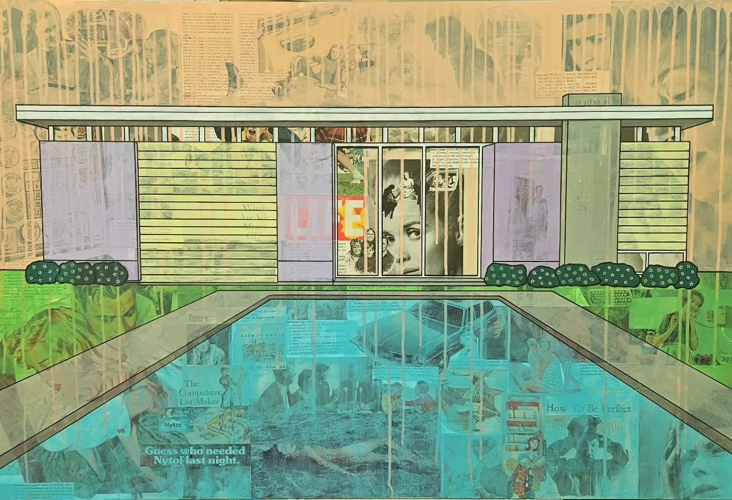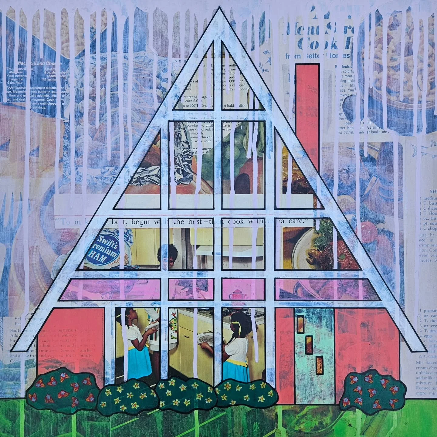 My work draws inspiration from childhood memories with my grandmother, flipping through magazines and cutting out paper dolls, which sparked my love for found imagery and collage. Using vintage print media layered beneath painted scenes of mid-century domestic architecture, I aim to invite viewers into a world of nostalgia, family life, and a touch of humor—come take a look at my art and see for yourself!