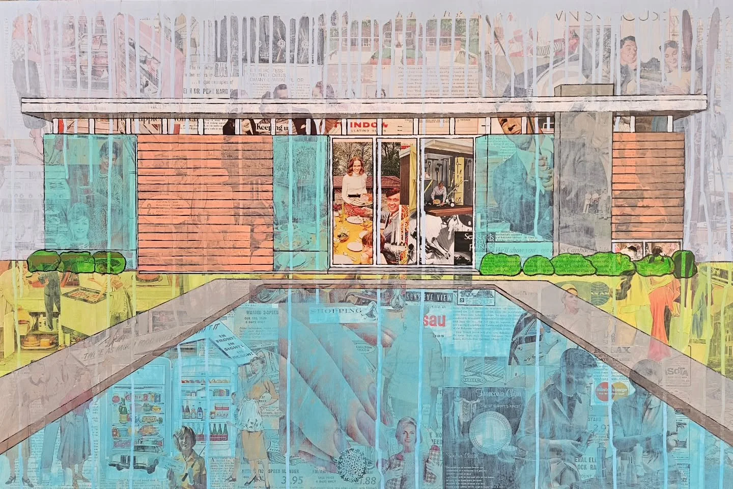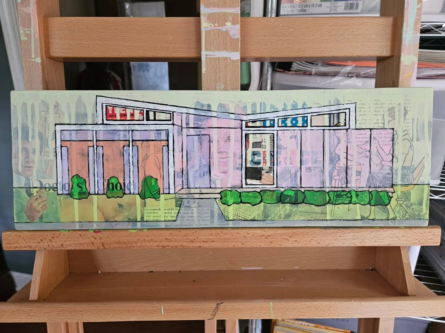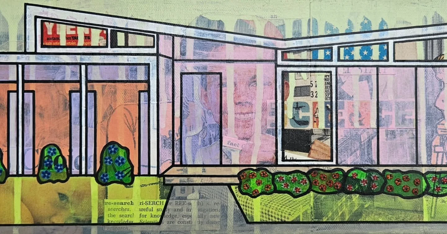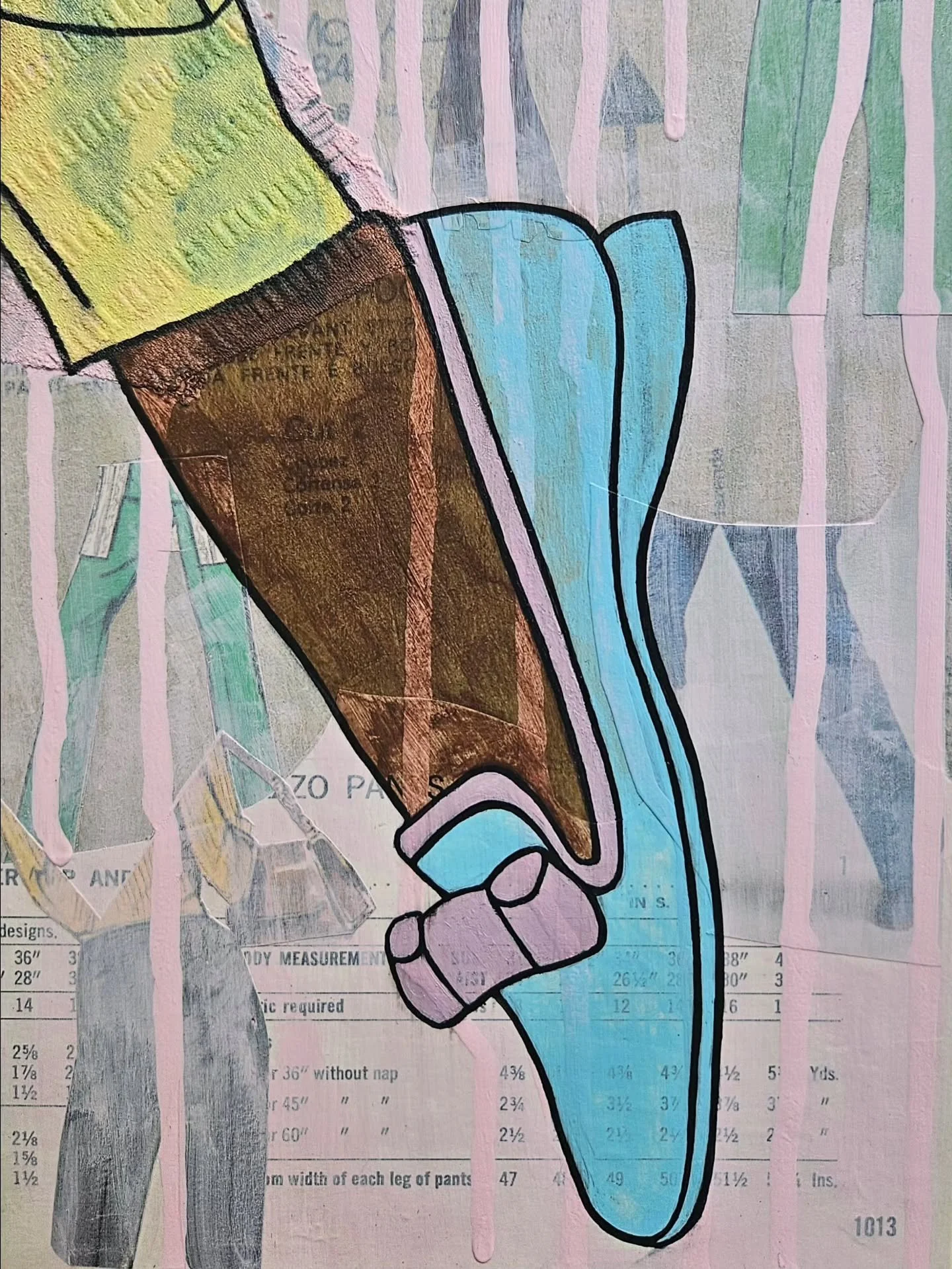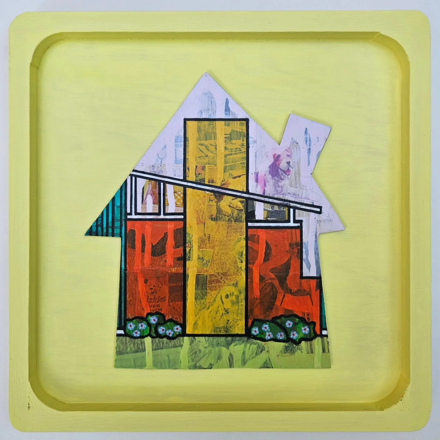 My work draws inspiration from childhood memories with my grandmother, flipping through magazines and cutting out paper dolls, which sparked my love for found imagery and collage. Using vintage print media layered beneath painted scenes of mid-century domestic architecture, I aim to invite viewers into a world of nostalgia, family life, and a touch of humor—come take a look at my art and see for yourself!