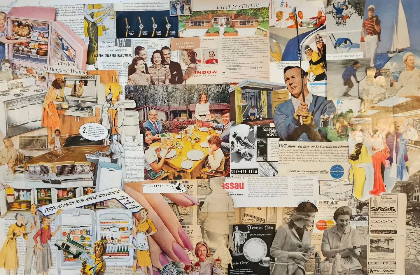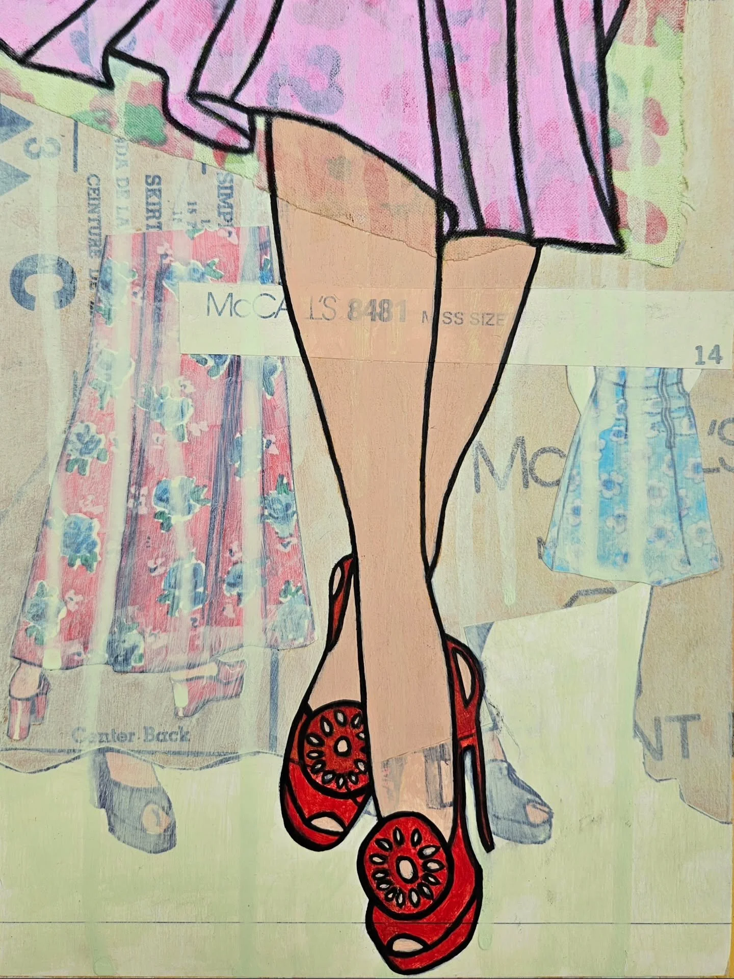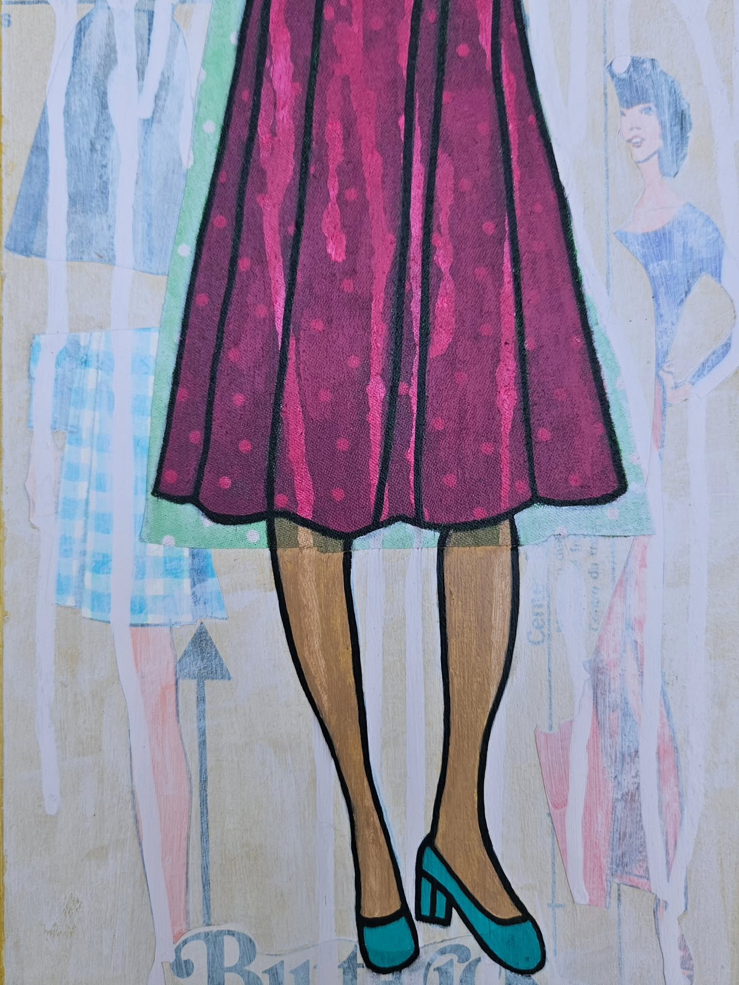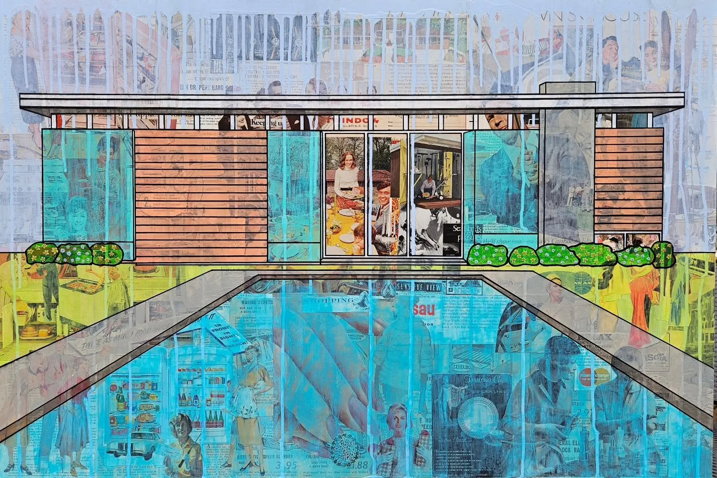My work draws inspiration from childhood memories with my grandmother, flipping through magazines and cutting out paper dolls, which sparked my love for found imagery and collage. Using vintage print media layered beneath painted scenes of mid-century domestic architecture, I aim to invite viewers into a world of nostalgia, family life, and a touch of humor—come take a look at my art and see for yourself!