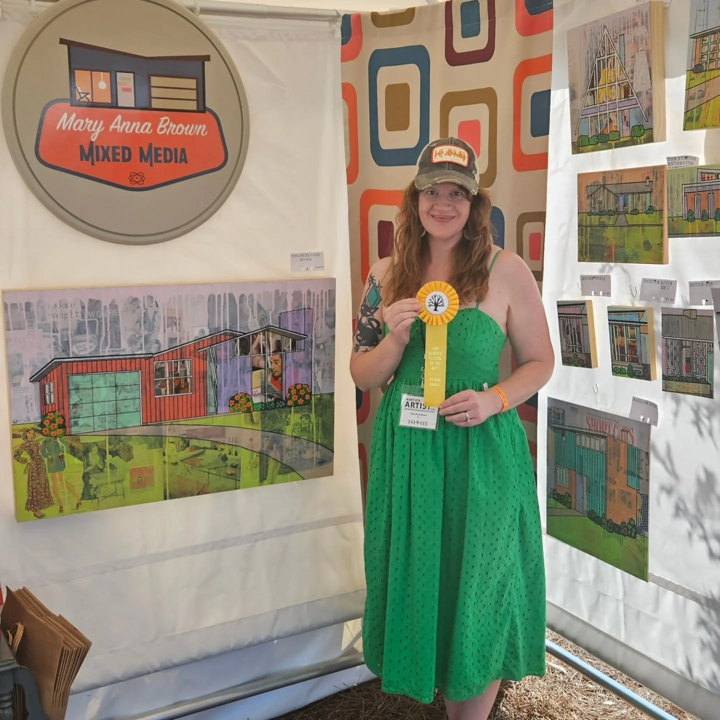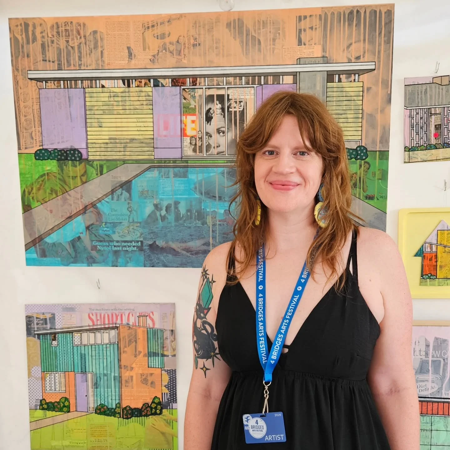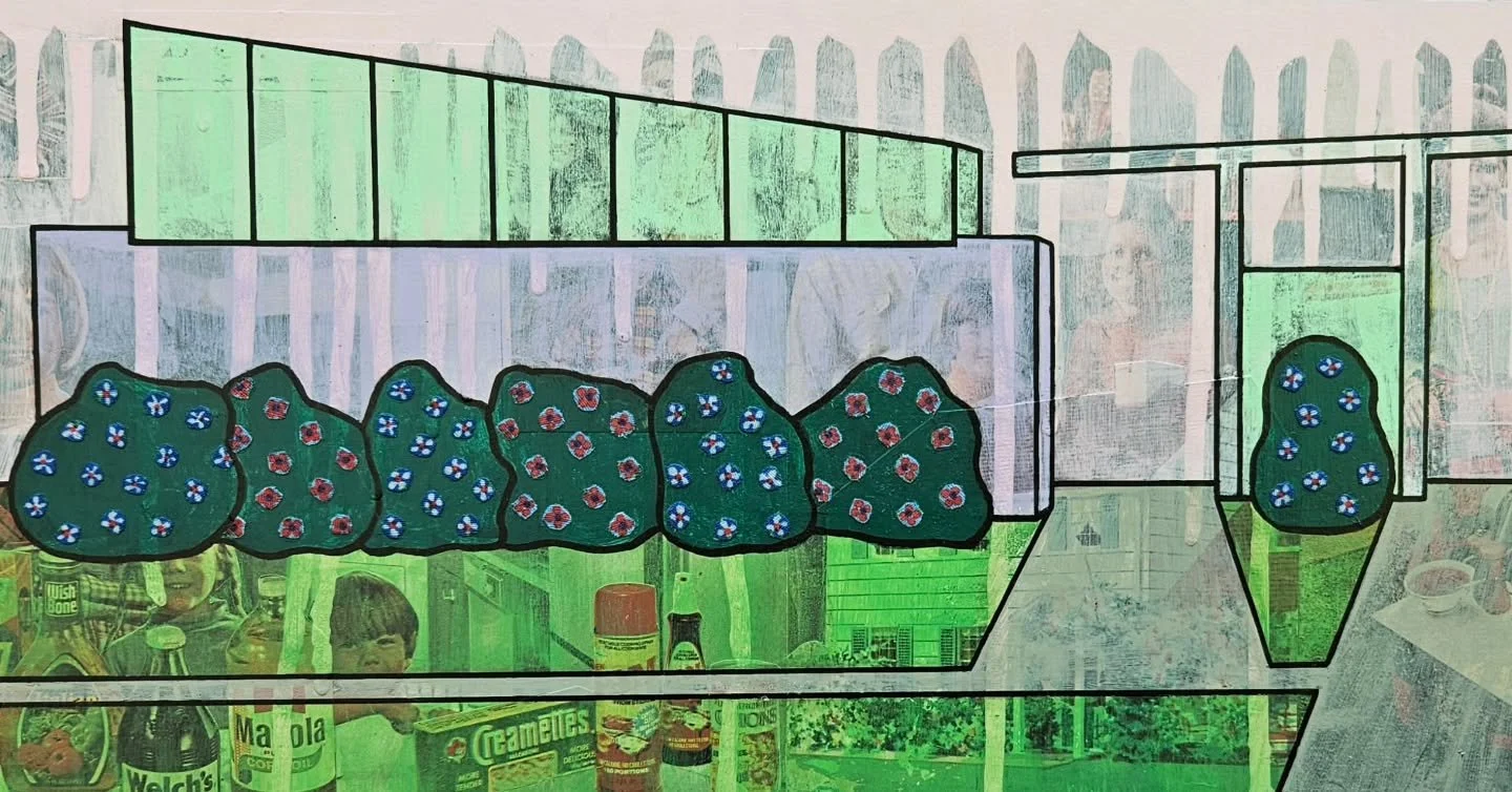 My work draws inspiration from childhood memories with my grandmother, flipping through magazines and cutting out paper dolls, which sparked my love for found imagery and collage. Using vintage print media layered beneath painted scenes of mid-century domestic architecture, I aim to invite viewers into a world of nostalgia, family life, and a touch of humor—come take a look at my art and see for yourself!